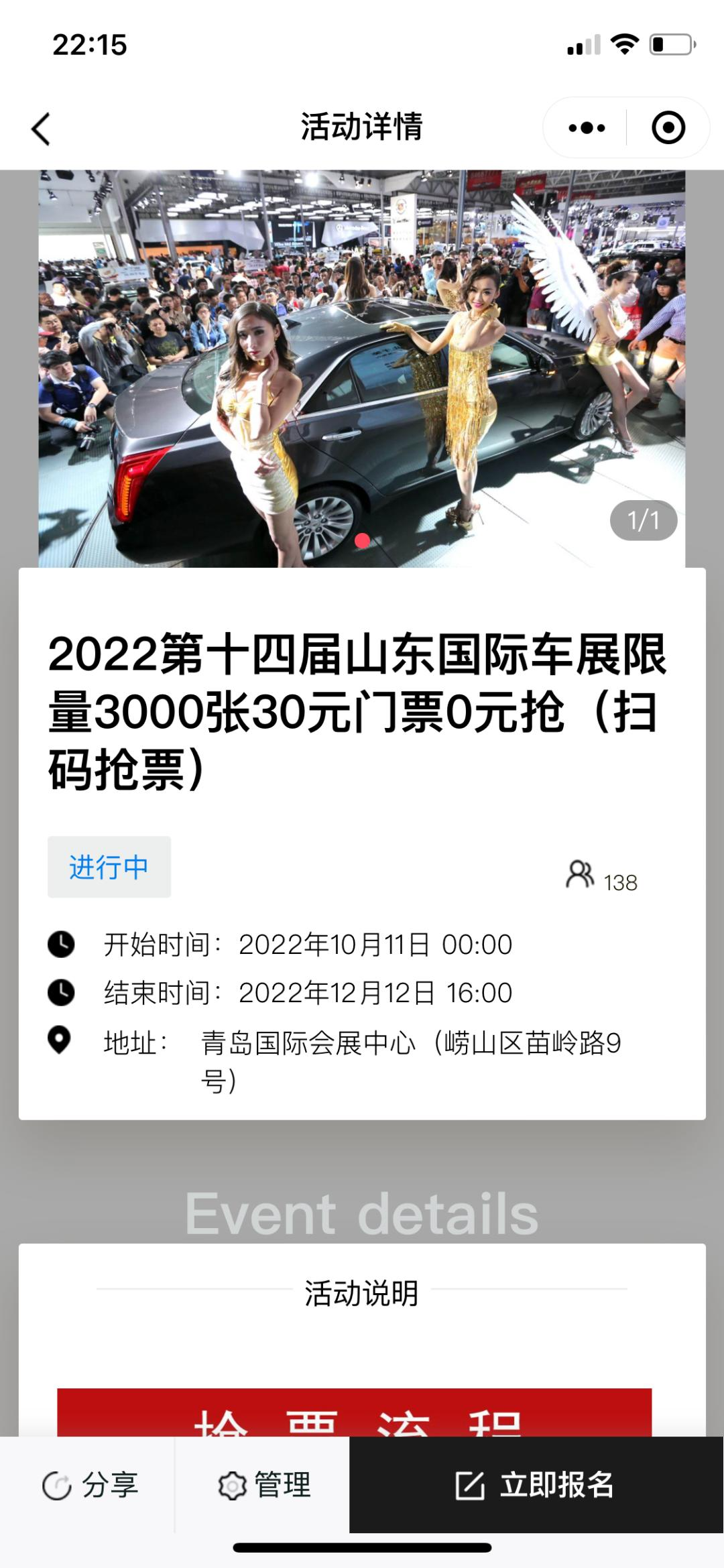 2022第十四届山东国际车展将于12月9日至12日在青岛国际会展中心(崂山区苗岭路9号)举行,本届山东国际车展依然设有门票,每张30元,不过——请看好,我们将为您献上超简单的门票福利,只需要您进行简单的操作,即可免费获取山东国际车展门票三张,价值90元。而且需要指出的是,此次车展门票福利数量有限,仅仅3000张,先“扫”先得!