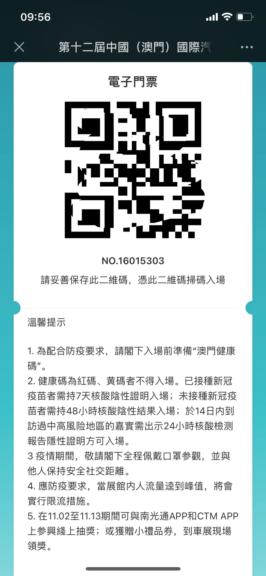 ⑤即可获取澳门车展入场电子门票,并截图保存以便查验