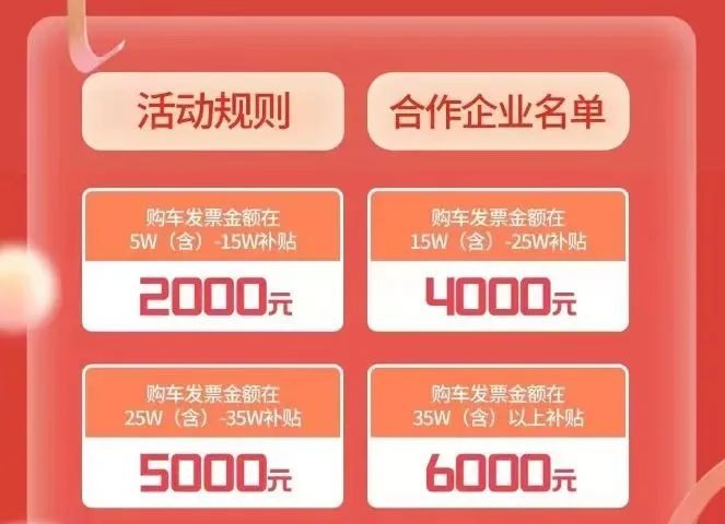 凡在指定合作的汽车销售企业,于活动时间内购买8 以下(含 8 座)家用新车(非企业购车、非二手车)的个人消费者,享受如下政府补贴政策: